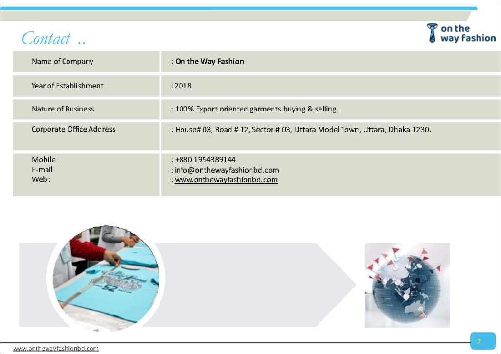 On The Way fashion is an unique apparel exporting & sourcing company establishment in the year 2018 with over 5 years history in Bangladesh specializing in an extensive range of casual and formal wears, for men’s, ladies & children wear.